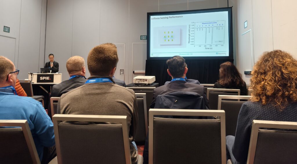The newly developed sensor utilises FBGs – periodic variations in the refractive index of an optical fiber core – inscribed point-by-point with femtosecond laser. These FBGs are integrated into a pneumatically actuated silicone membrane positioned at the tip of a 15mm diameter palpation probe, compatible with standard trocar ports used in MIS procedures.