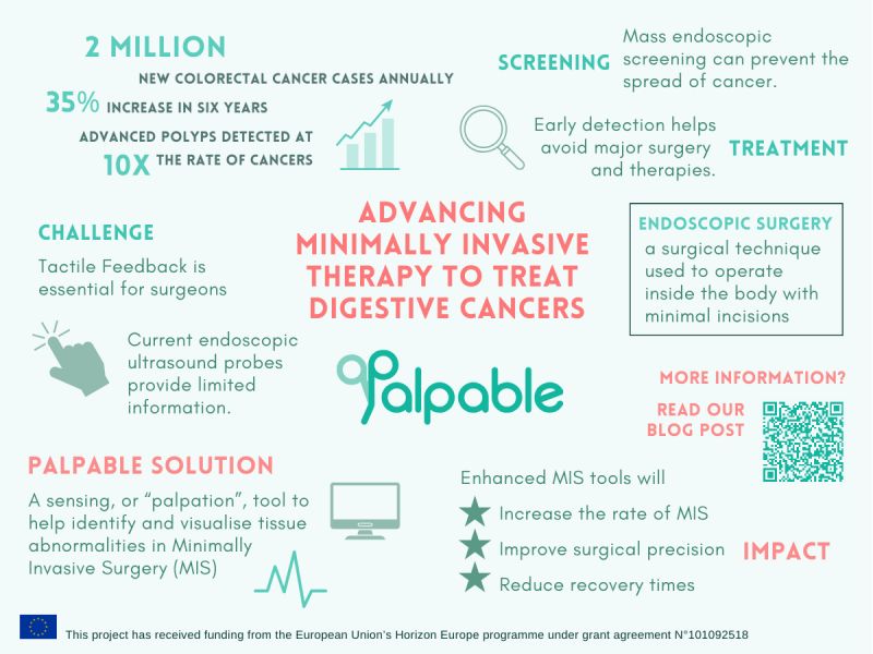 PALPABLE will advance the state of the art in photonics, soft robots, haptic & tactile sensing, sensor development, cost-effective manufacturing and sensor data fusion and will deliver a novel tactile sensing probe to be used as a palpation tool for identification and visualization of tissue abnormalities for use in Minimally Invasive Surgery. The introduction of a new medical tool for Minimally Invasive Surgery will have societal and economical impacts. Adding tactile feedback to the current armamentarium of the endoscopic surgeon with surely help to increase the rate of procedures performed in a minimally invasive way, taking advantage of existing technology that allows increased precision (and quality) in surgery.